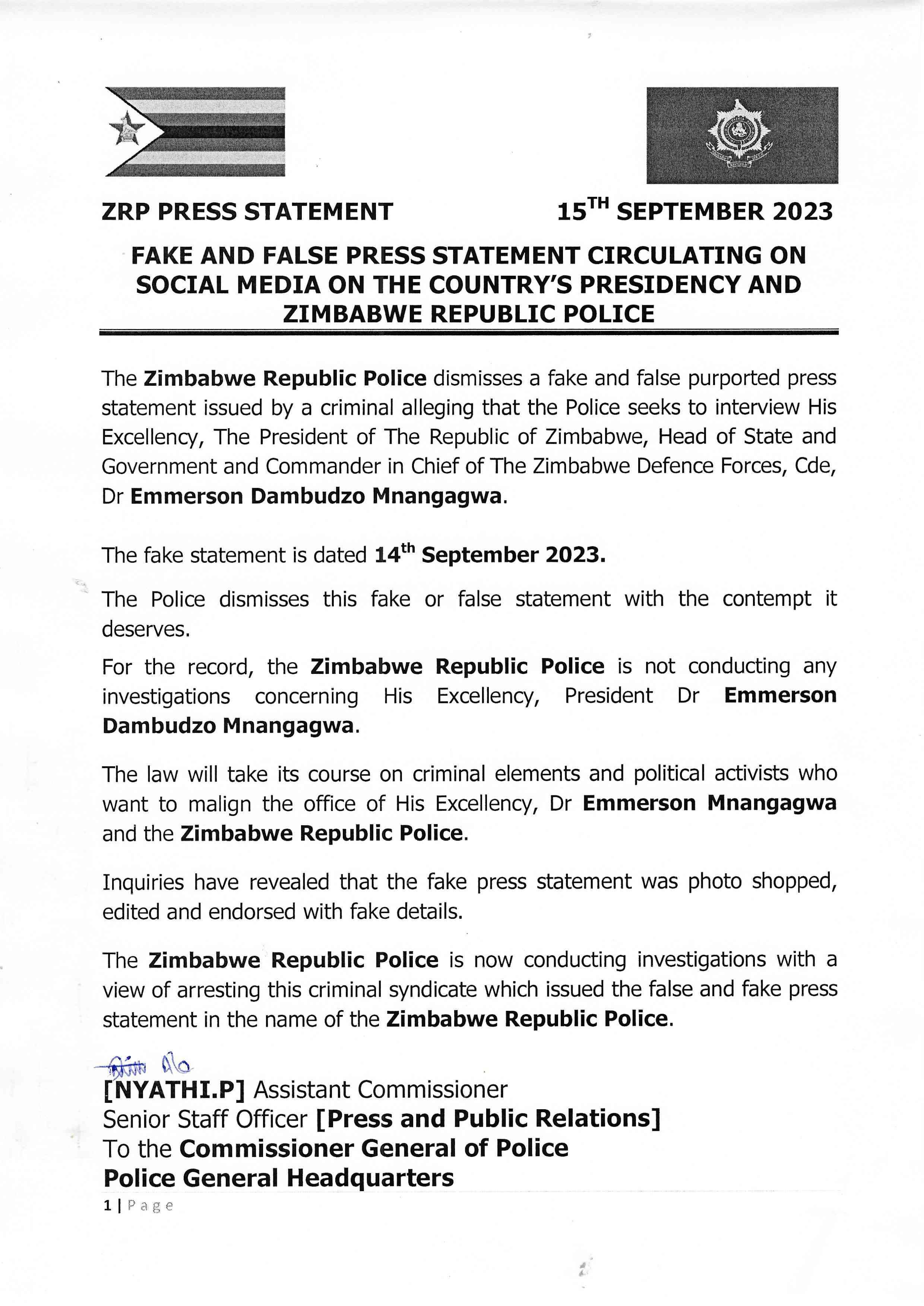 However, national police spokesperson assistant commissioner Paul Nyathi has dismissed the statement as fake saying that it was "photo shopped, edited and endorsed with fake details.""The ZRP dismisses a fake and false purported press statement issued by a criminal alleging that the Police seeks to interview His Excellency, The President of The Republic of Zimbabwe," said Nyathi.
