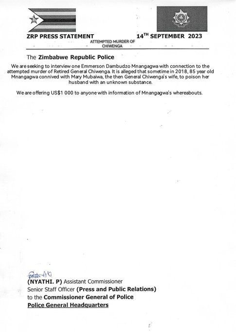 "It is alleged that sometime in 2018, 85 year old Mnangagwa connived with Mary Mubaiwa, the then General Chiwenga's wife, to poison her husband with an unknown substance," reads part of the statement, which featured ZRP's logo and Assistant Commissioner Nyathi's signature.