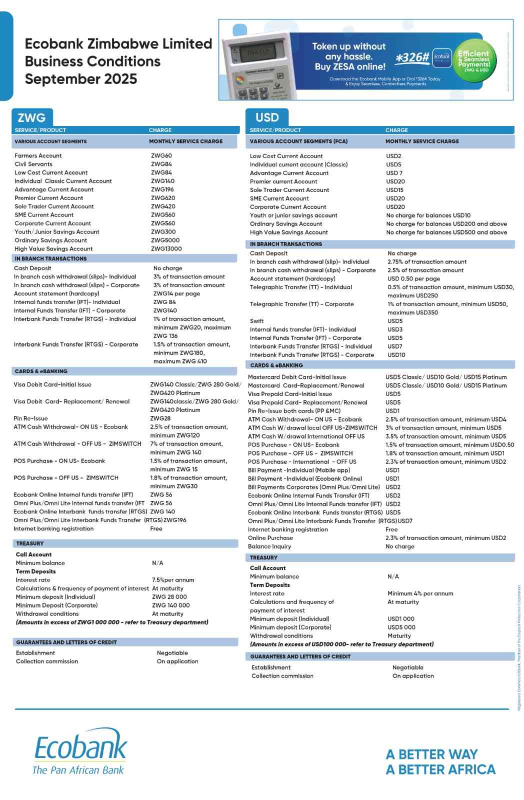 Ecobank Zimbabwe Limited posts its service charges update for all its offerings as of September 2025.