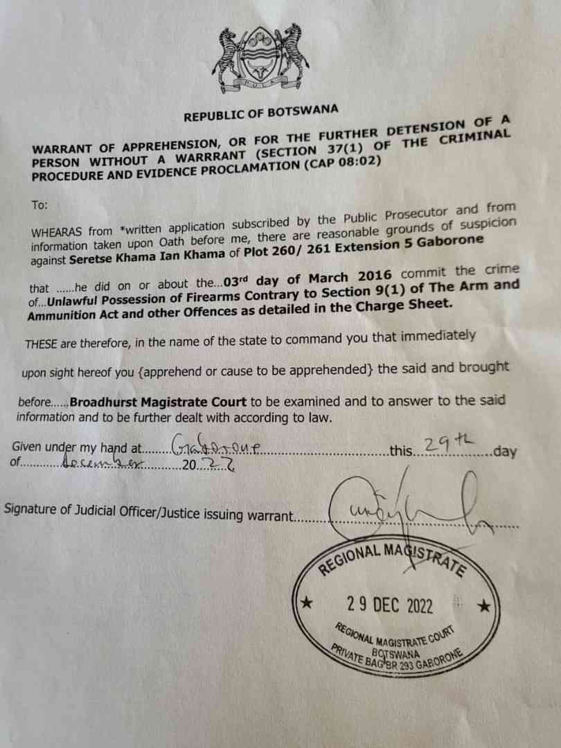 A warrant of arrest has been issued for former Botswana President Ian Khama. The warrant of arrest has been granted by the regional magistrate at Broadhurst in Botswana.
