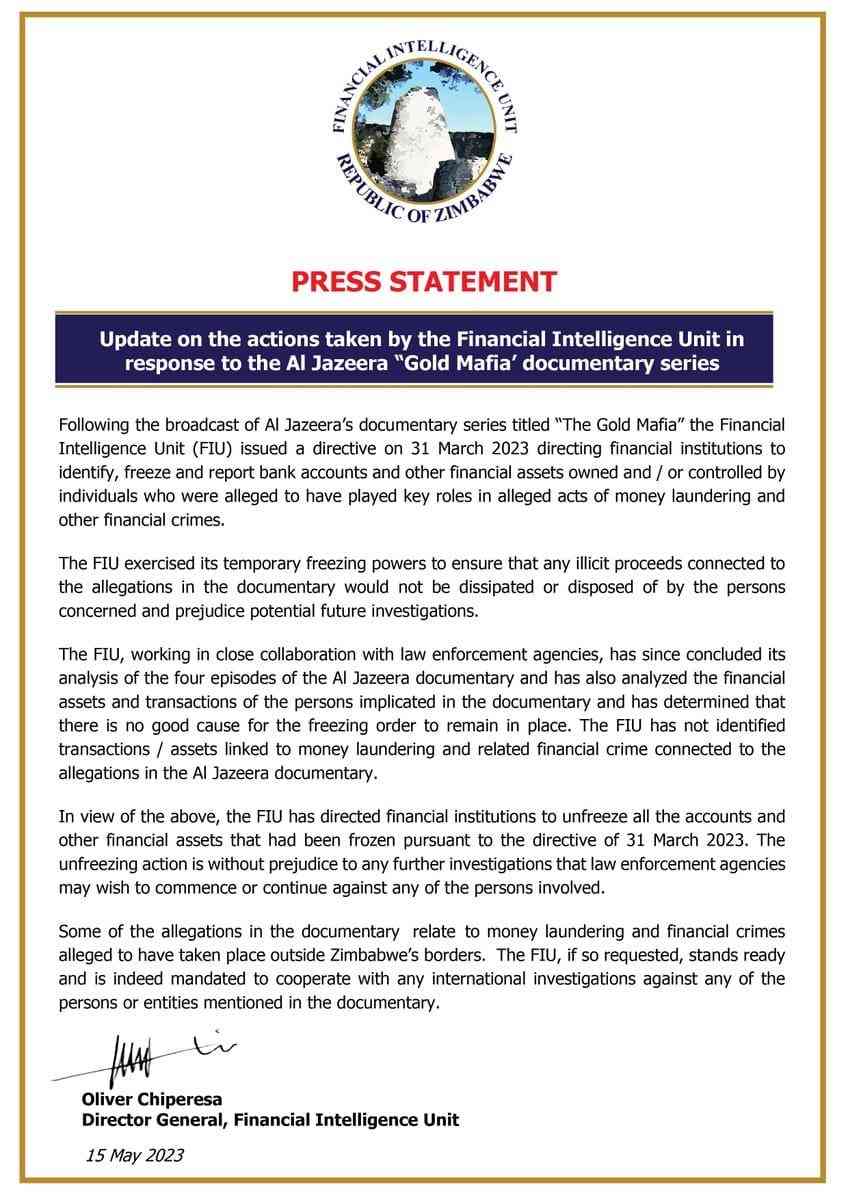 THE Reserve Bank of Zimbabwe (RBZ)’s Financial Intelligence Unit (FIU) yesterday made a summersault by reversing its order for banks to freeze accounts of several government officials and individuals who were implicated in gold smuggling gold and money laundering activities exposed by the Al Jazeera documentary.