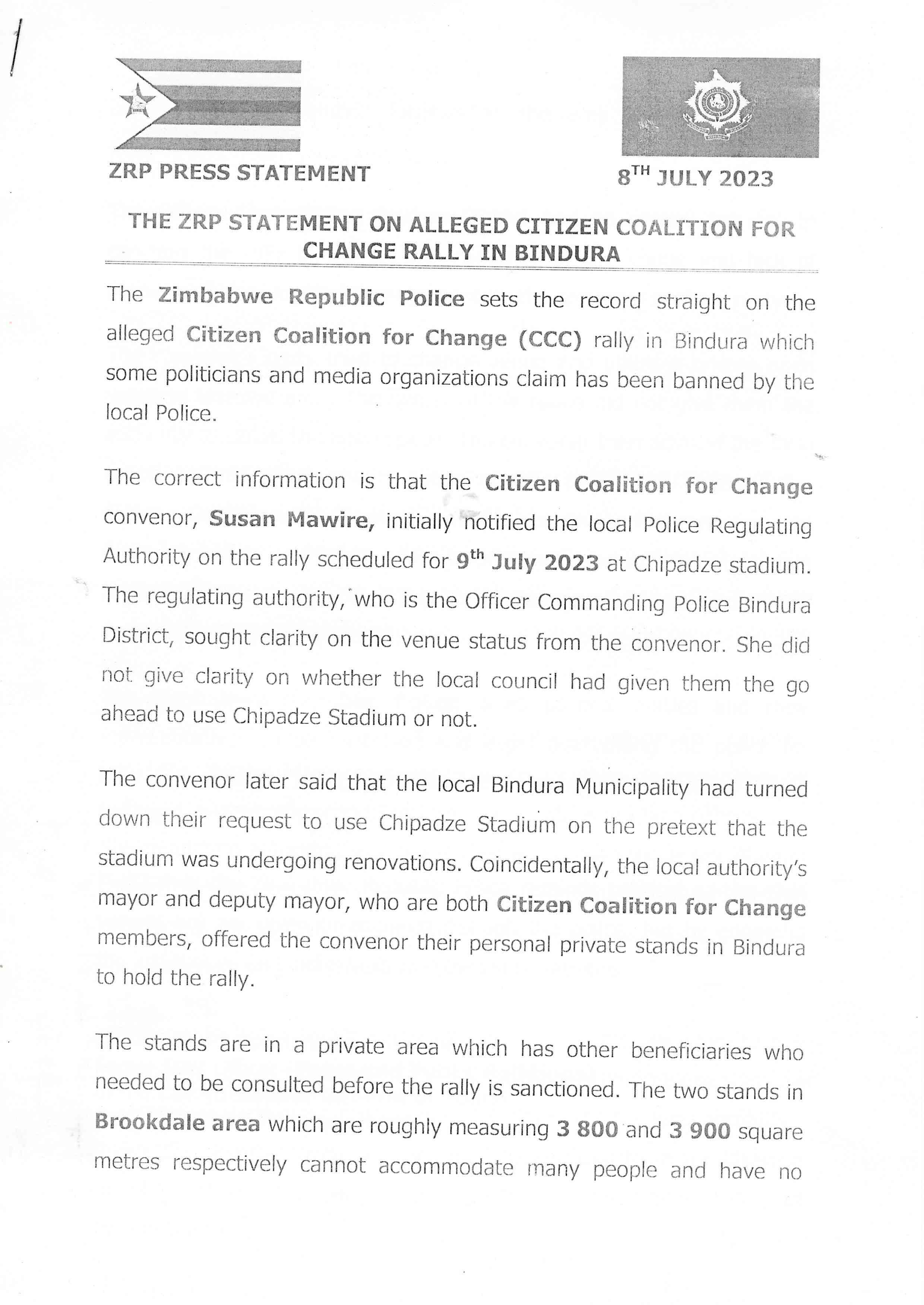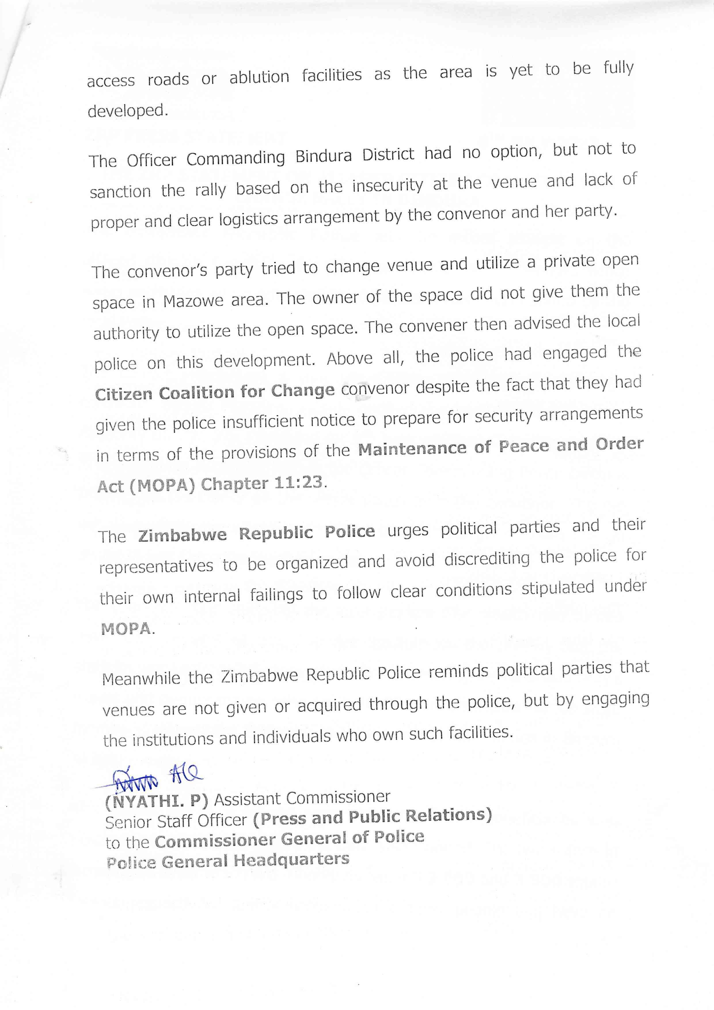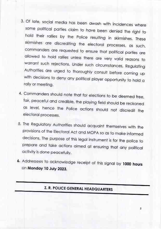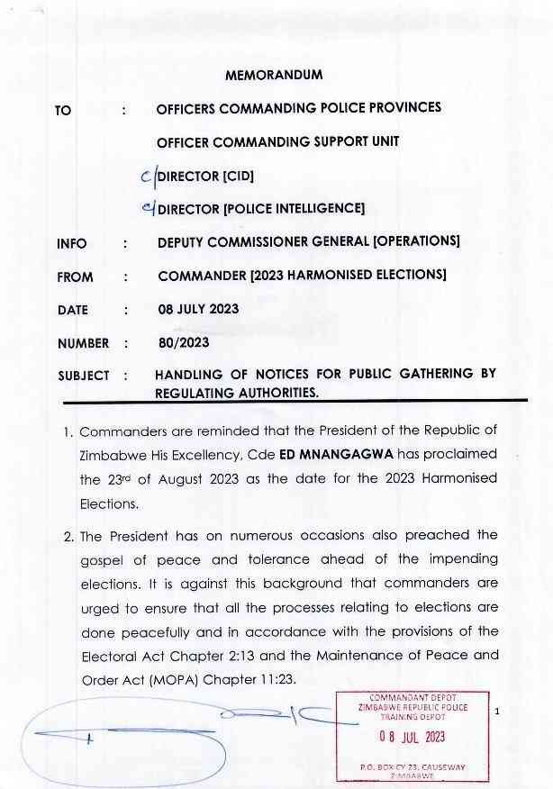 The memorandum dated July 8 comes as opposition Citizens Coalition for Change has been denied permission to conduct rallies on several occasions, the latest being the Bindura official campaign launch.