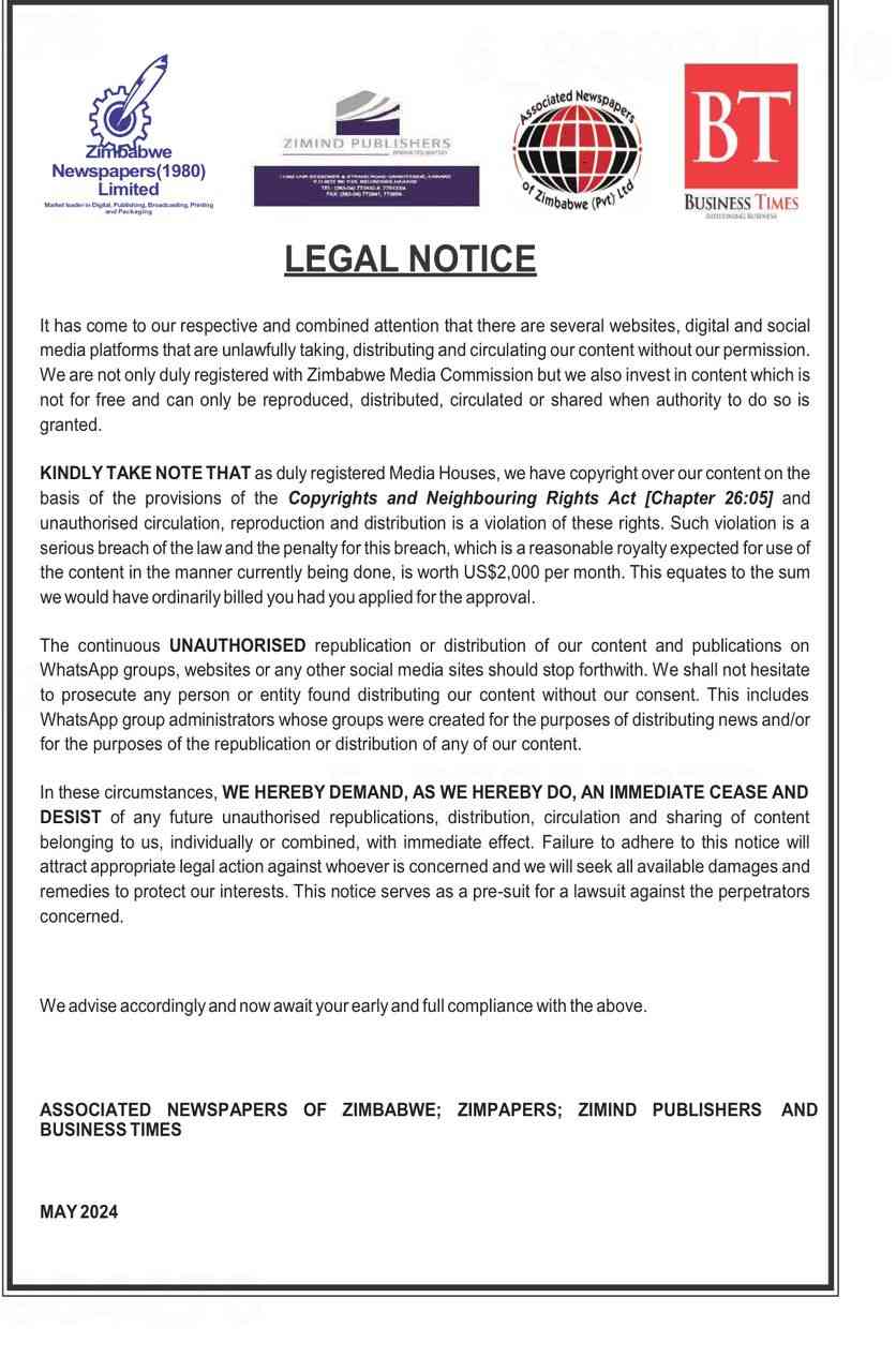 In a legal notice yesterday, ZimInd Publishers, Associated Newspapers of Zimbabwe, Zimpapers and Business Times said media houses had copyrights provided for in the Copyrights and Neighbouring Rights Act [Chapter 26:05] which protect their content from theft.