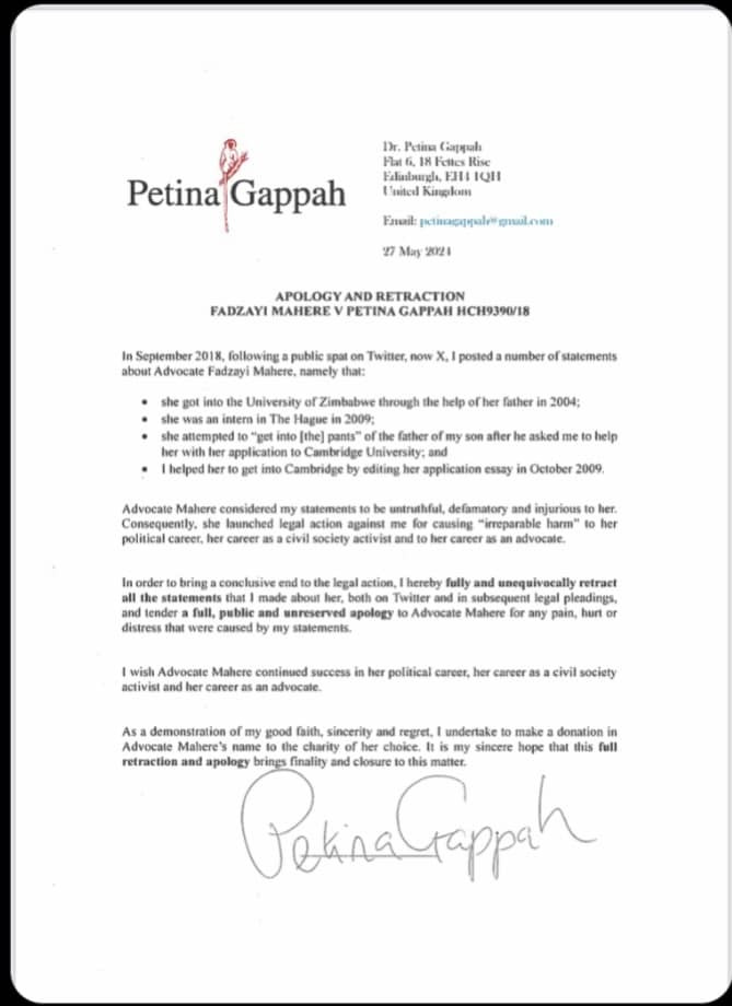 As an act of penitence, Gappah also highlighted that she looks forward to donating to a charity of Mahere’s choice and wish her continued success in her political career and her legal career.