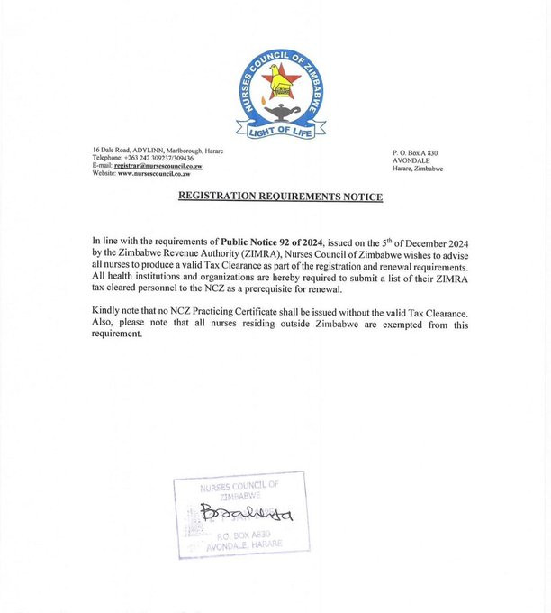 ‘‘In line with the requirements of Public Notice 92 of 2024, issued on the 5th of December 2024 by the Zimbabwe Revenue Authority (ZIMRA), Nurses Council of Zimbabwe wishes to advise all nurses to produce a valid tax clearance as part of the registration and renewal requirements’’ NCZ wrote in a statement released Tuesday.