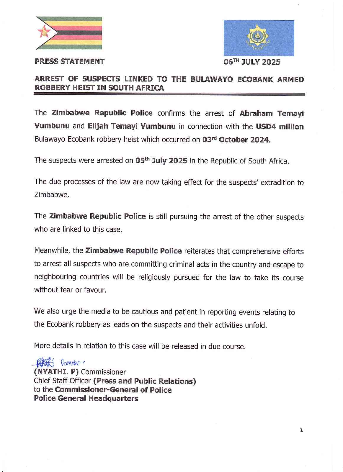 “The due processes of the law are now taking effect for the suspects' extradition to Zimbabwe. The Zimbabwe Republic Police is still pursuing the arrest of the other suspects who are linked to this case.