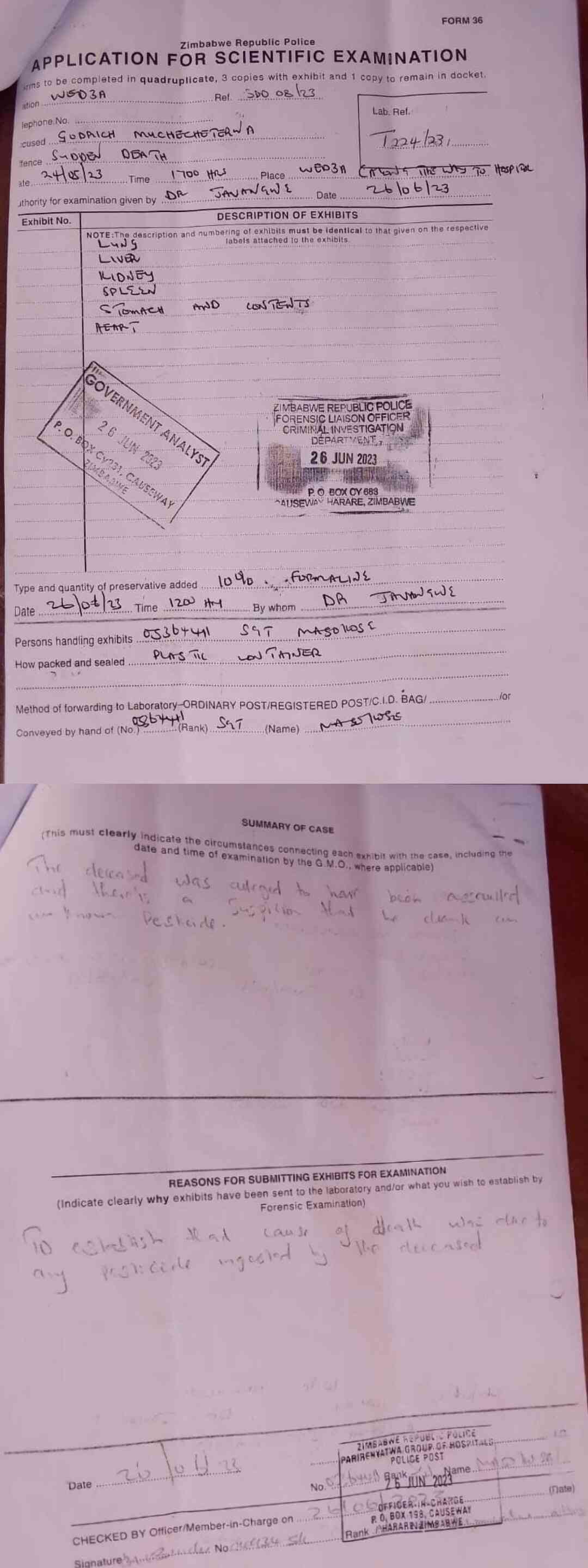 At first, it was believed that the promising young man had consumed poison after visiting his girlfriend Tanatswa Moleni’s homestead in the Mukarati area near Garabha shopping centre, Hwedza, Mashonaland East province.