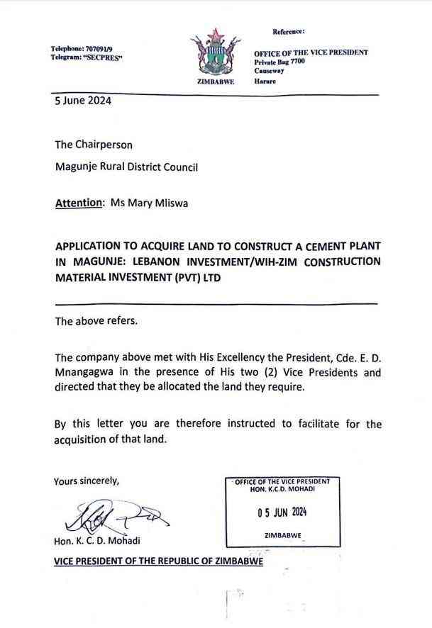 It was one of the co-Vice-Presidents, Kembo Mohadi, who wrote to the Hurungwe Rural District Council under whose jurisdiction the cement project is being developed, instructing the local authority to cede 135 hectares of land to a Chinese mining company.