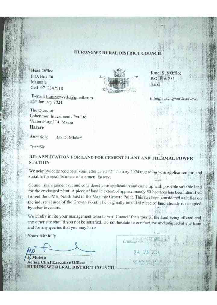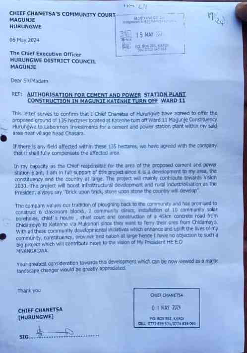 “This letter serves to confirm that I, Chief Chanetsa of Hurungwe, has agreed to offer the ground of 135 hectares located at Katenhe turn-off ward 11, Magunje Constituency, Hurungwe, to Labenmon Investments for a cement and power station plant within my said area near village head Chasara,” he wrote.