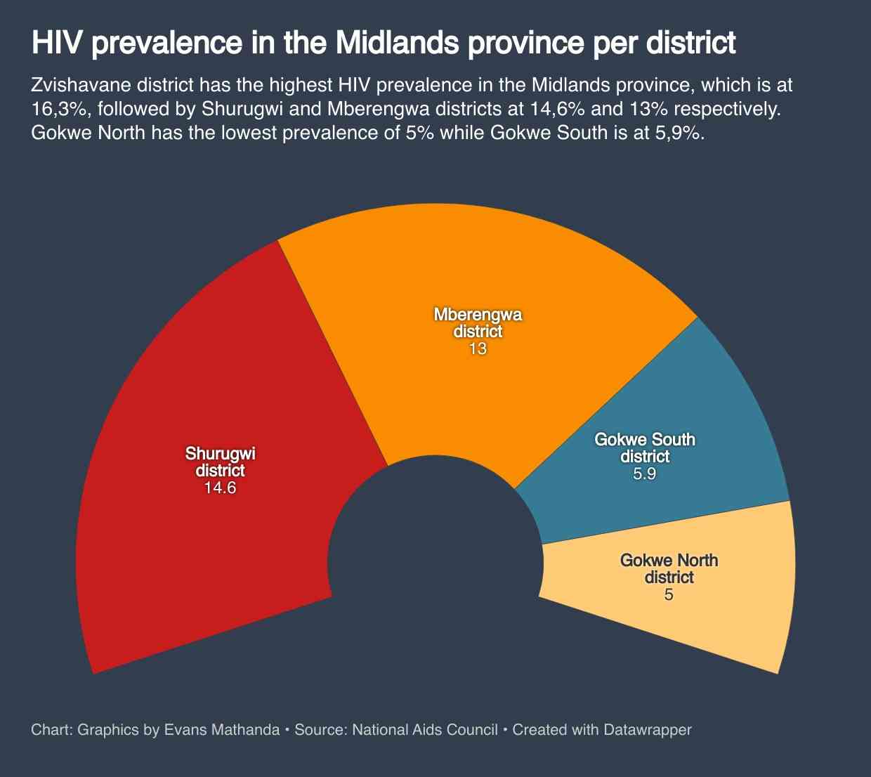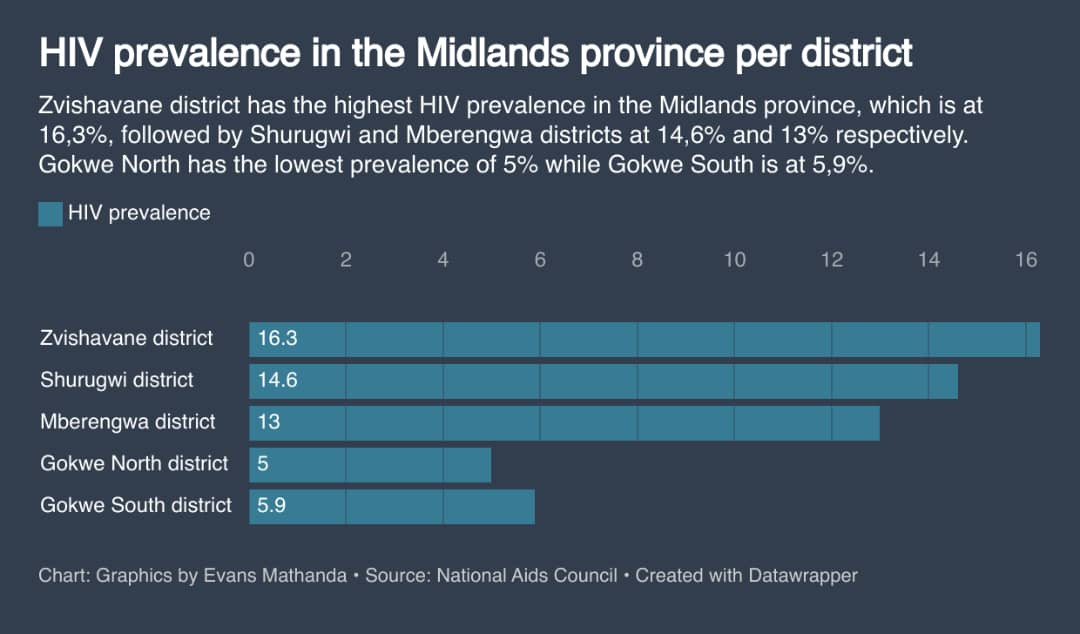 Zvishavane district has the highest HIV prevalence in the Midlands province, at 16,3%, followed by Shurugwi and Mberengwa districts at 14,6% and 13%, respectively.