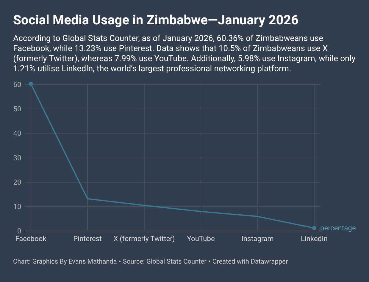 According to the GlobalStats Counter, as of January 2026, 60,36% of Zimbabweans use Facebook, while 13,23% use Pinterest.