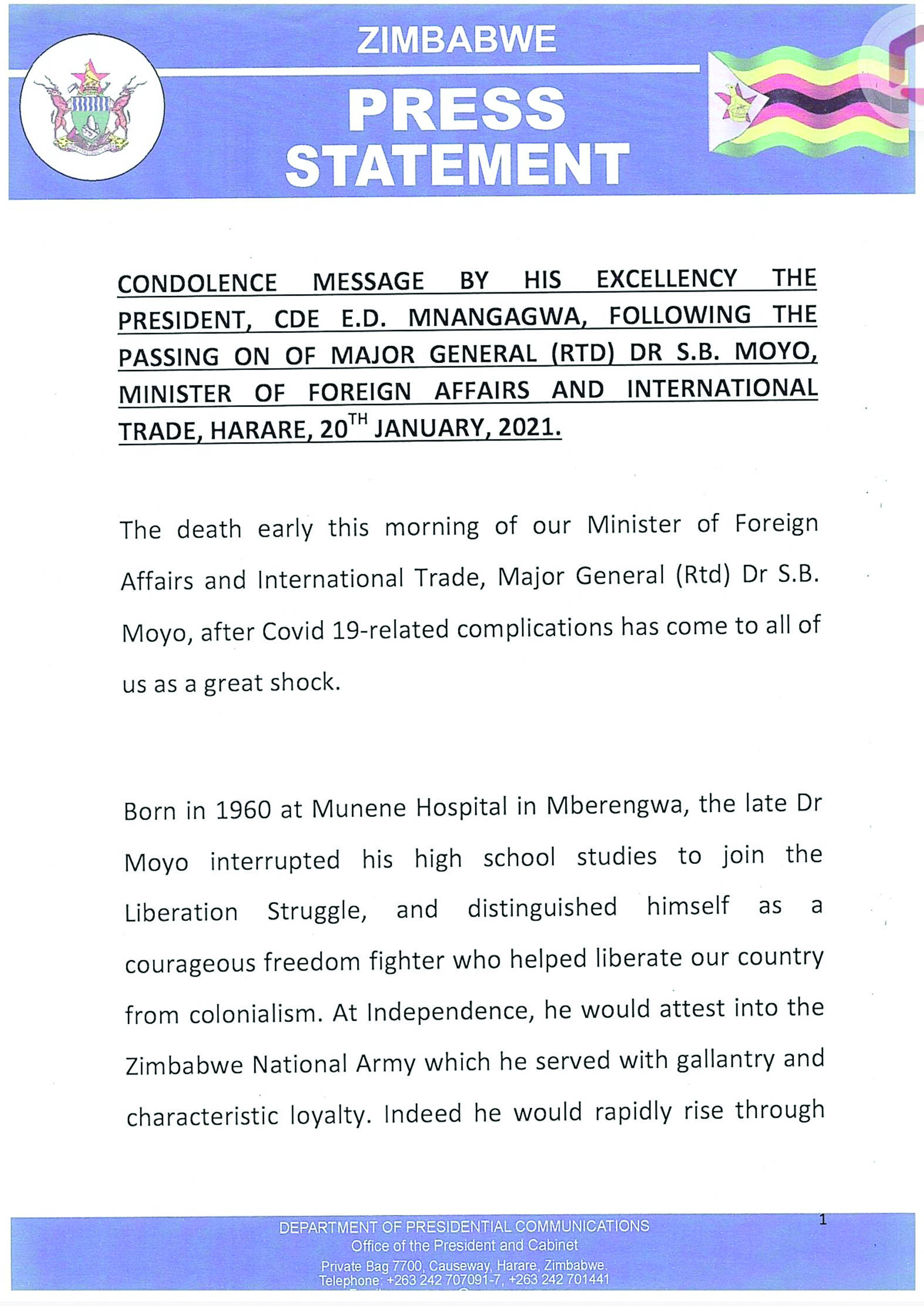 Mnangagwa mourns ‘friend’ SB MoyoThe death early this morning of our Minister of Foreign Affairs and International Trade, Rtd Lieutenant General, Dr S.B. Moyo, after COVID-19-related complications, has come to all of us as a great shock.