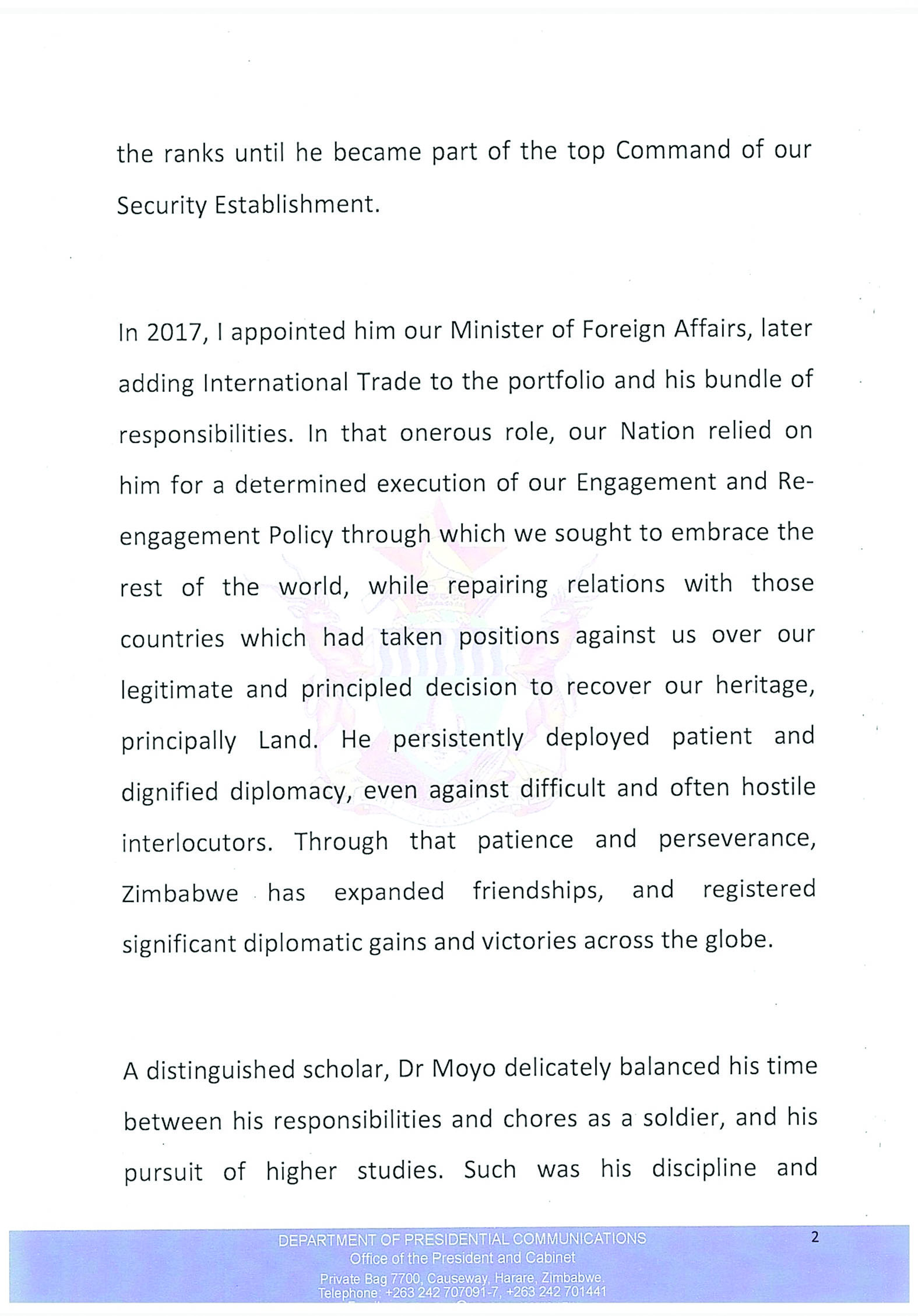 “He persistently deployed patience and dignified diplomacy even against difficult and often hostile interlocutors.” In May last year, Moyo was embroiled in a war of words with then Information deputy minister Energy Mutodi over a diplomatic gaffe by the latter who publicly criticised Tanzanian President John Magufuli’s handling of the coronavirus outbreak in the east African country.