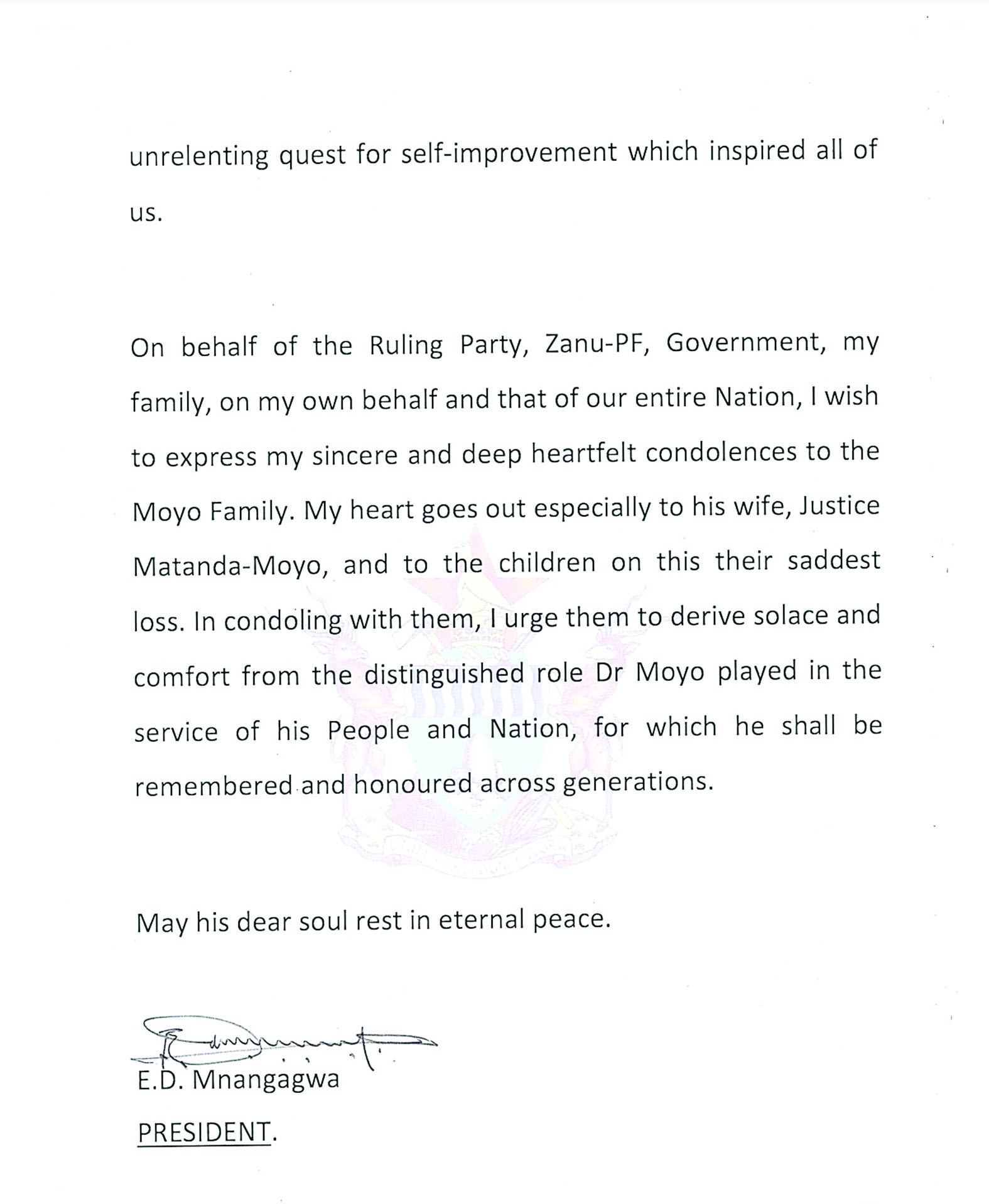 Such was his discipline and unrelenting quest for self-improvement which inspired all. On behalf of the ruling party, Zanu PF, government, my family, on my own behalf and that of our entire nation, I wish to express my sincere and deep heartfelt condolences to the Moyo family.