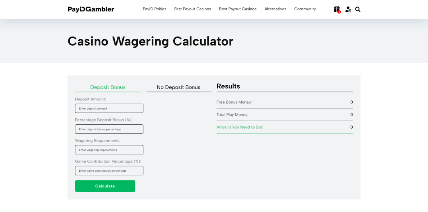 “It can be used for both deposit and no-deposit types of bonuses. To see the results, a player needs to fill in the text field with the info that can be found at the casino site in the description of the promotion, such as bonus percentage, wagering requirements, game contribution percentage, and deposit amount that a player plans to make. After adding the necessary data, the program shows how much free bonus money a gambler will get, total play money, and, most importantly, the amount that should be bet to meet the wagering requirements. The wagering calculator is a game-changing feature that will make the choice of bonuses and the whole process of planning gameplay much easier and more effective for our PayIDGambler readers. Besides, it also helps avoid issues with withdrawals,” — shares Alexis Collins, the founder of PayIDGambler.