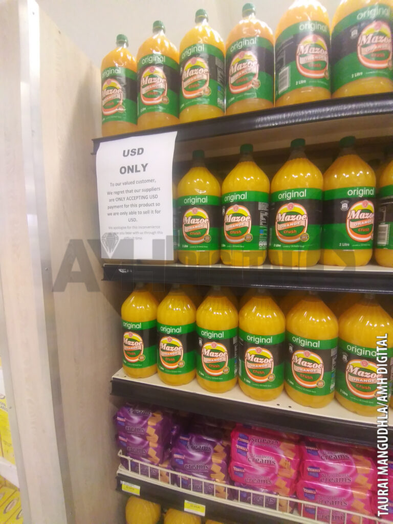 A snap survey by NewsDay yesterday revealed that several shops in Harare, Bulawayo and Beitbridge are now demanding US dollars only for products such as sterilised milk, Mazoe Orange Crush juice, sugar, cooking oil and other products.