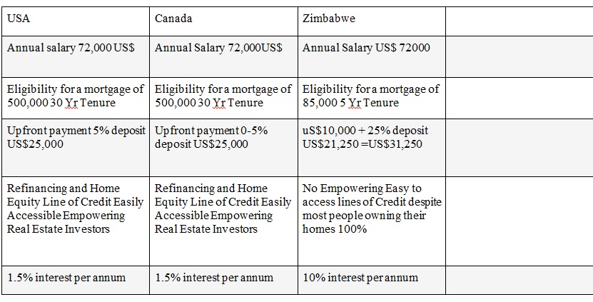 Worse still most Zimbabweans have 100% equity in their properties . If the monetary authorities and banks copy and paste products in the USA and Canada a lot of home owners would refinance or access home equity line of credit automatically and use the money to generate more wealth.