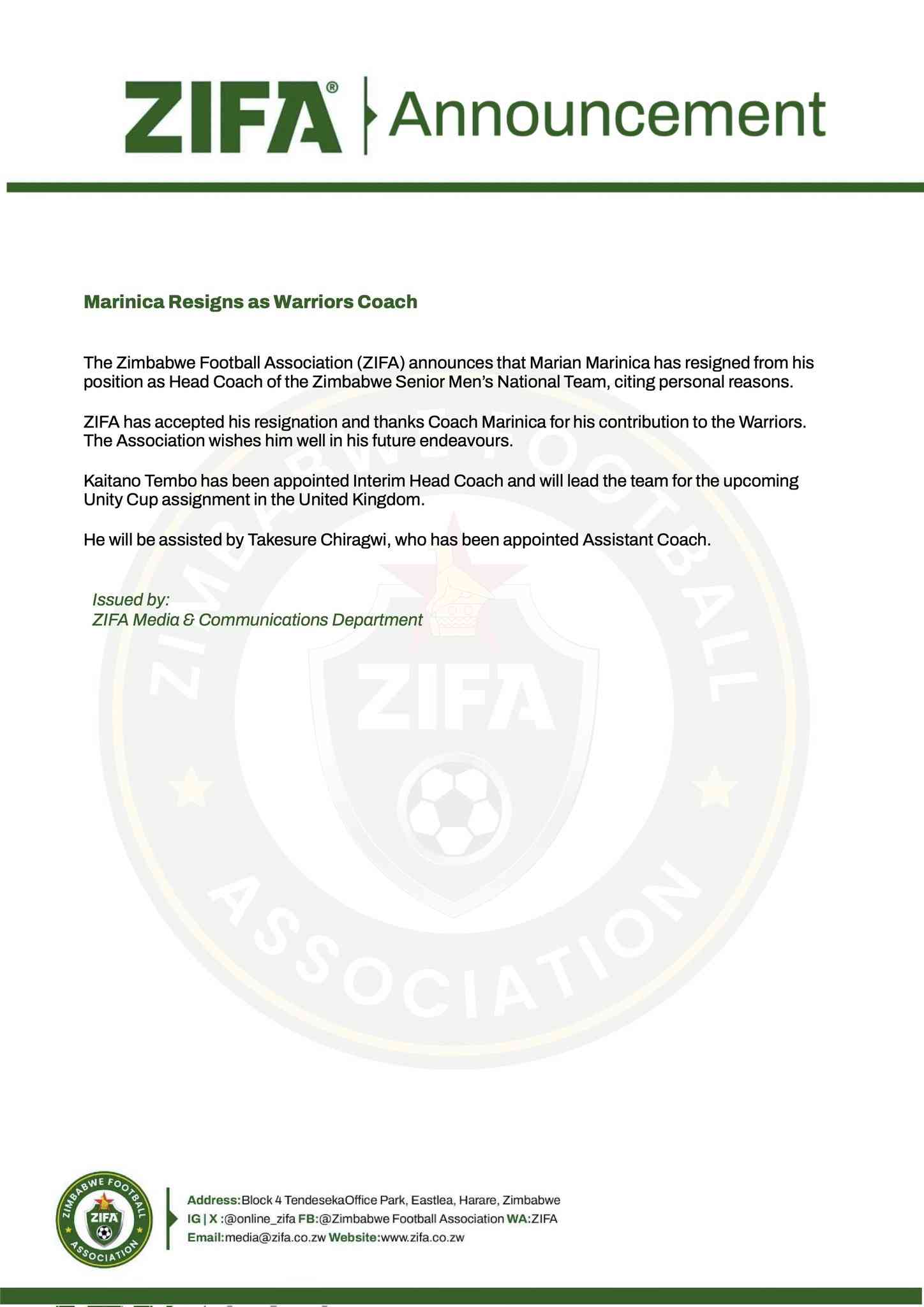 “The association thanks Coach Marinica for his service to the Warriors and wishes him well in his future endeavours,” Zifa said.