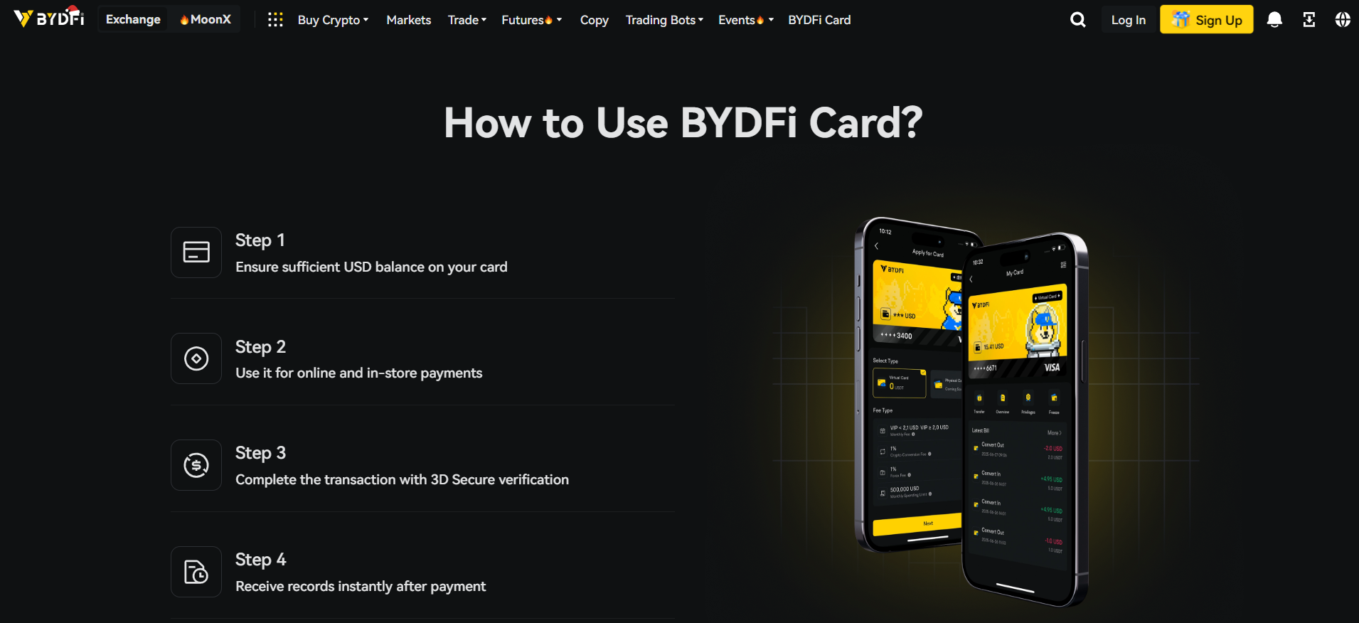 - Transactions settle instantly through your BYDFi wallet